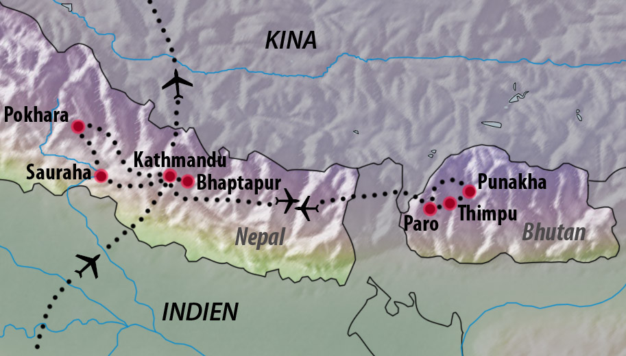 Resan börjar i Nepals huvudstad Kathmandu där vi bl.a. beundrar flera av de världsarv som finns i staden med omnejd.